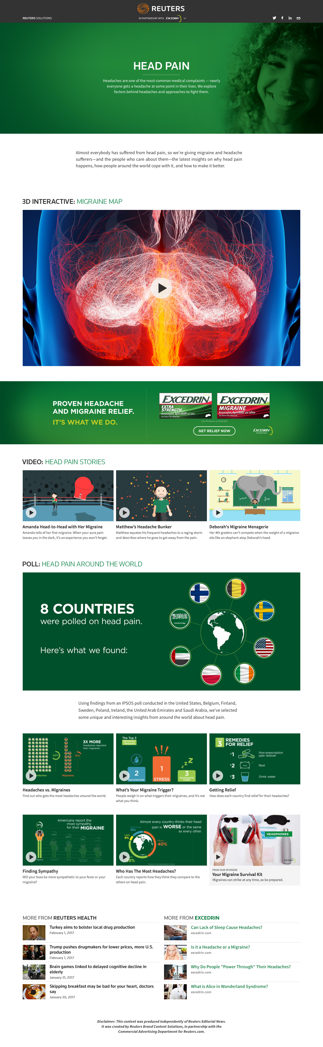An in-depth Reuters feature on migraines, in partnership with Excedrin. Complete "hub" destination with several content pieces developed and hosted on reuters.com. All features are fully responsive and traffic was driven by means of native, social and custom "Canvas" units.